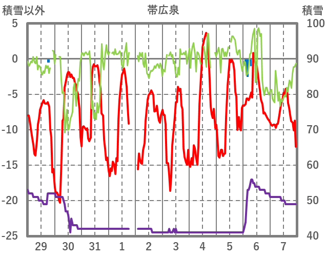 | 日 | 時 | 気温 | 降水 | 風向/風速 | 日照 | 積雪 | 降雪 |