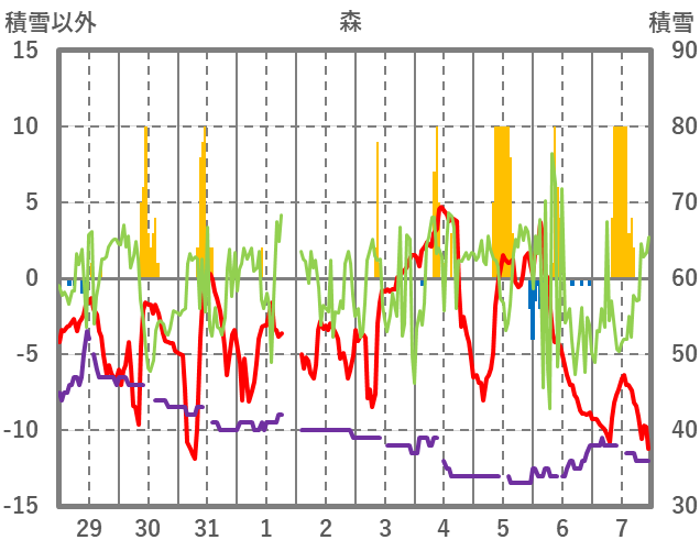 | 日 | 時 | 気温 | 降水 | 風向/風速 | 日照 | 積雪 | 降雪 |