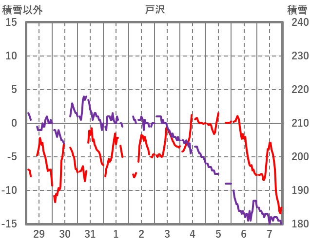 | 日 | 時 | 気温 | 降水 | 風向/風速 | 日照 | 積雪 | 降雪 |