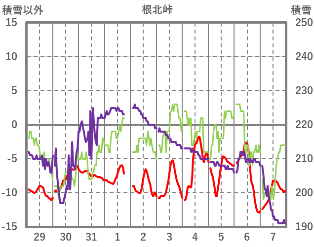 | 日 | 時 | 気温 | 降水 | 風向/風速 | 日照 | 積雪 | 降雪 |