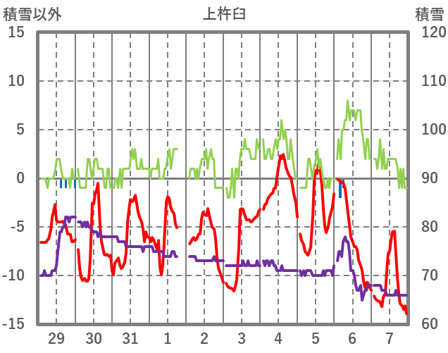 | 日 | 時 | 気温 | 降水 | 風向/風速 | 日照 | 積雪 | 降雪 |