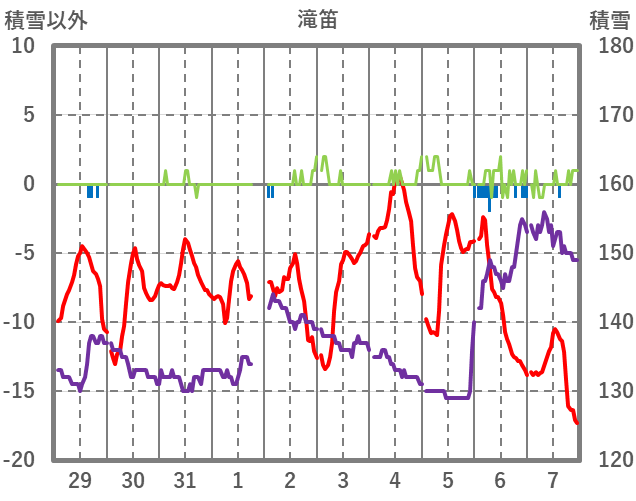 | 日 | 時 | 気温 | 降水 | 風向/風速 | 日照 | 積雪 | 降雪 |