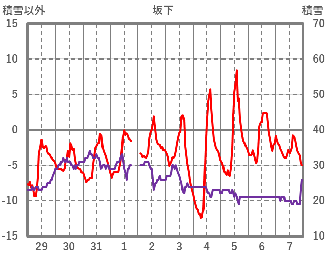 | 日 | 時 | 気温 | 降水 | 風向/風速 | 日照 | 積雪 | 降雪 |