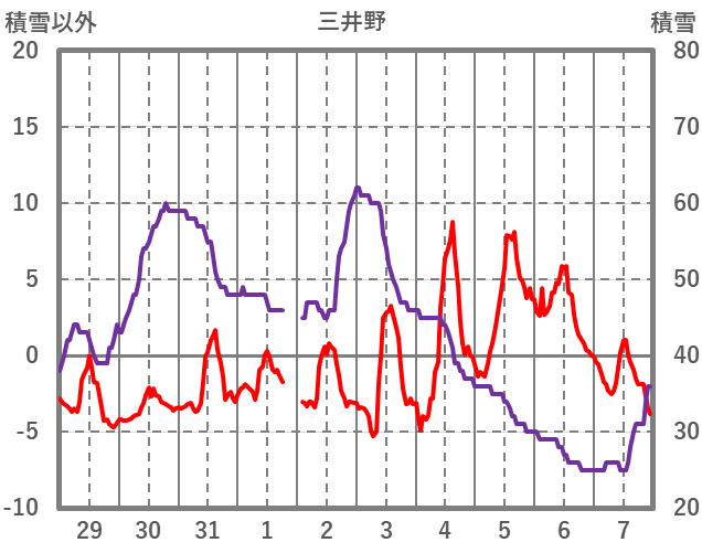 | 日 | 時 | 気温 | 降水 | 風向/風速 | 日照 | 積雪 | 降雪 |