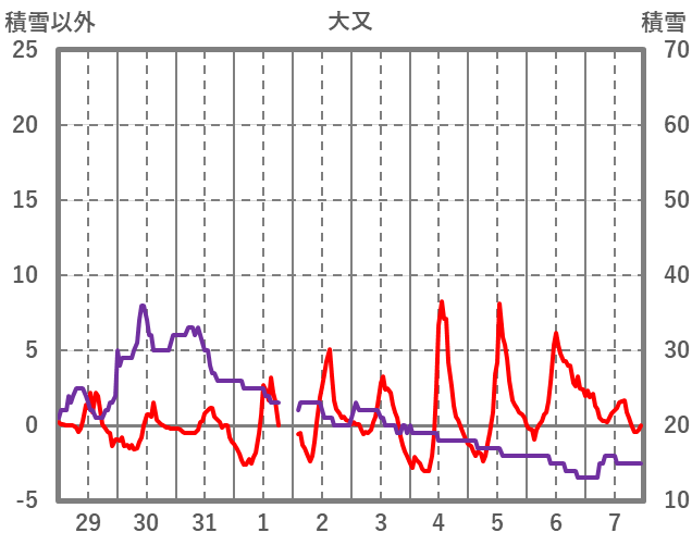 | 日 | 時 | 気温 | 降水 | 風向/風速 | 日照 | 積雪 | 降雪 |