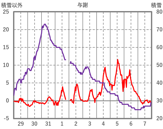 | 日 | 時 | 気温 | 降水 | 風向/風速 | 日照 | 積雪 | 降雪 |