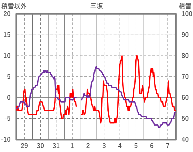 | 日 | 時 | 気温 | 降水 | 風向/風速 | 日照 | 積雪 | 降雪 |