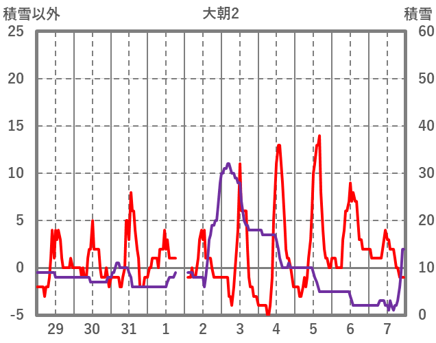 | 日 | 時 | 気温 | 降水 | 風向/風速 | 日照 | 積雪 | 降雪 |