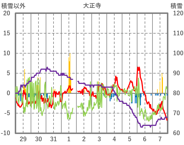 | 日 | 時 | 気温 | 降水 | 風向/風速 | 日照 | 積雪 | 降雪 |