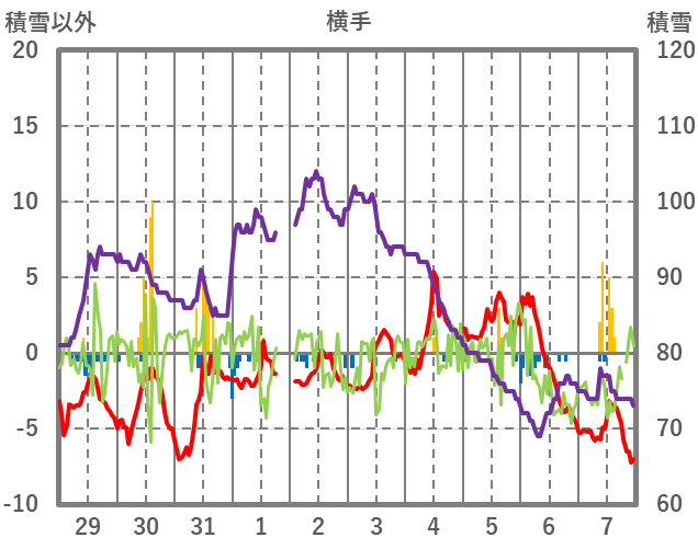 | 日 | 時 | 気温 | 降水 | 風向/風速 | 日照 | 積雪 | 降雪 |