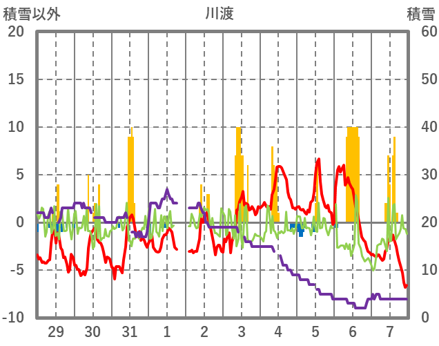 | 日 | 時 | 気温 | 降水 | 風向/風速 | 日照 | 積雪 | 降雪 |