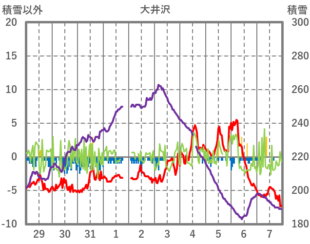 | 日 | 時 | 気温 | 降水 | 風向/風速 | 日照 | 積雪 | 降雪 |
