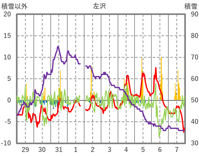| 日 | 時 | 気温 | 降水 | 風向/風速 | 日照 | 積雪 | 降雪 |