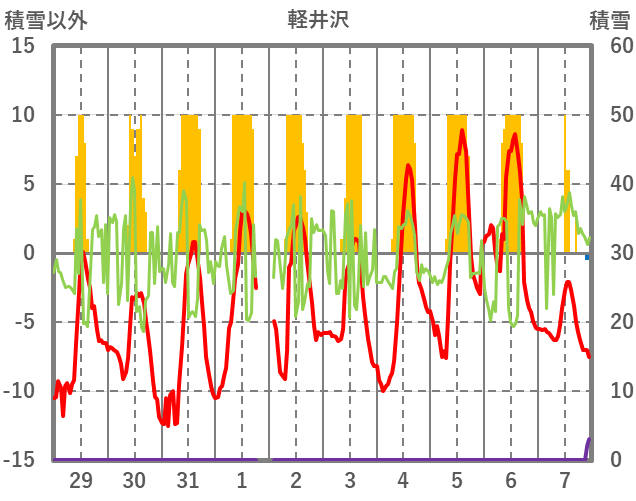 | 日 | 時 | 気温 | 降水 | 風向/風速 | 日照 | 積雪 | 降雪 |