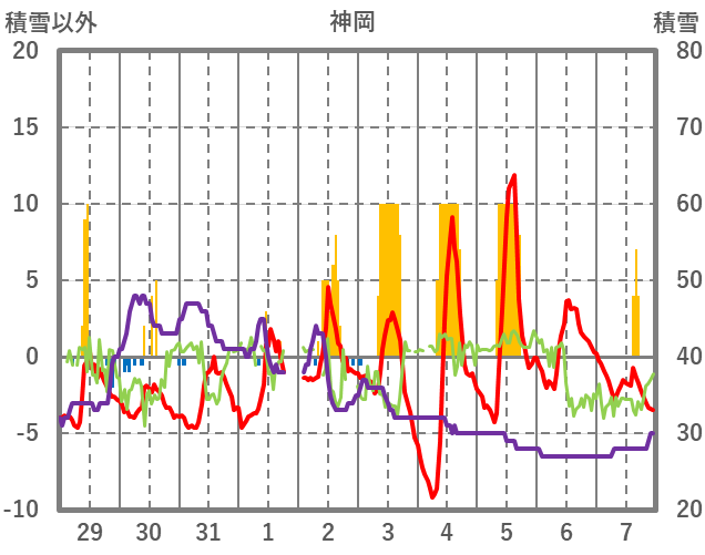 | 日 | 時 | 気温 | 降水 | 風向/風速 | 日照 | 積雪 | 降雪 |