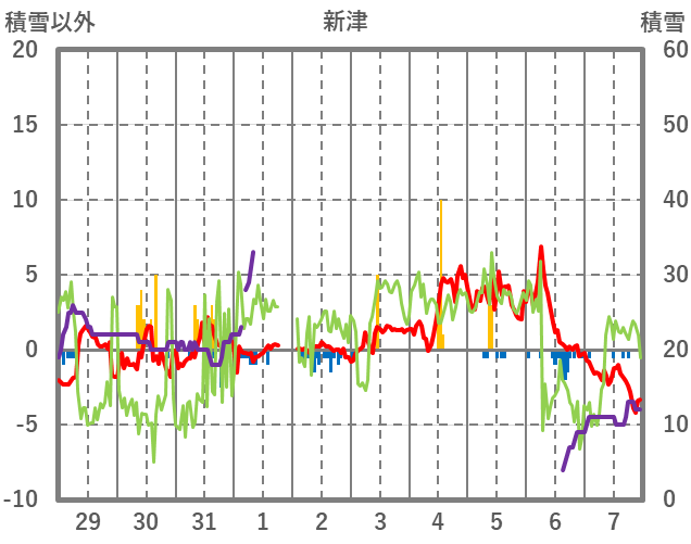 | 日 | 時 | 気温 | 降水 | 風向/風速 | 日照 | 積雪 | 降雪 |
