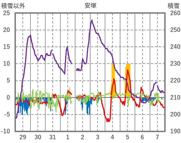 | 日 | 時 | 気温 | 降水 | 風向/風速 | 日照 | 積雪 | 降雪 |