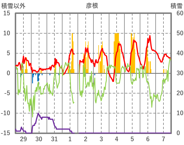 | 日 | 時 | 気温 | 降水 | 風向/風速 | 日照 | 積雪 | 降雪 |