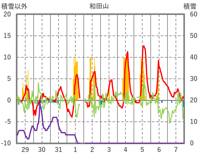 | 日 | 時 | 気温 | 降水 | 風向/風速 | 日照 | 積雪 | 降雪 |