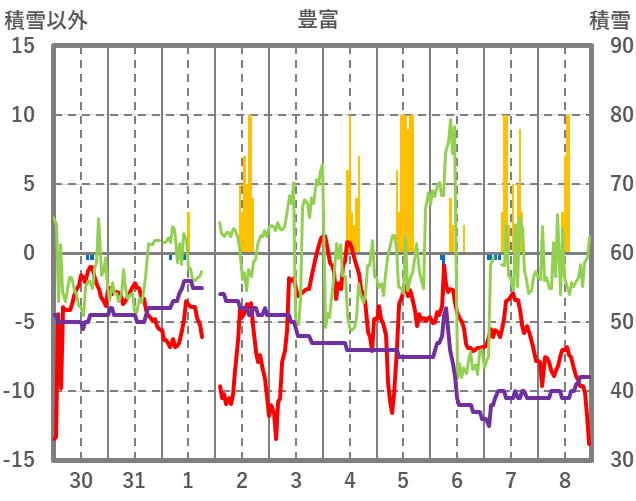 | 日 | 時 | 気温 | 降水 | 風向/風速 | 日照 | 積雪 | 降雪 |