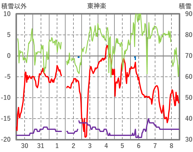 | 日 | 時 | 気温 | 降水 | 風向/風速 | 日照 | 積雪 | 降雪 |