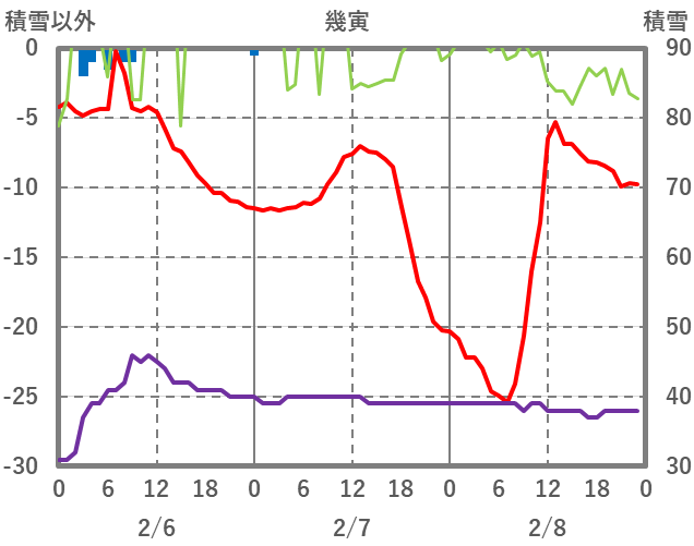 | 日 | 時 | 気温 | 降水 | 風向/風速 | 日照 | 積雪 | 降雪 |