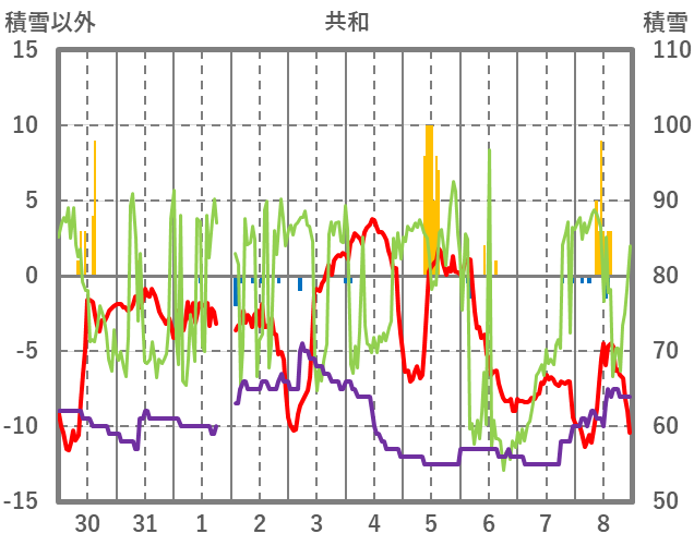 | 日 | 時 | 気温 | 降水 | 風向/風速 | 日照 | 積雪 | 降雪 |