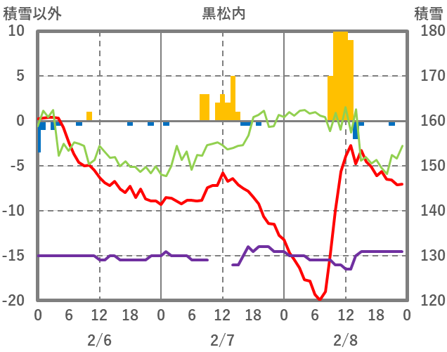 | 日 | 時 | 気温 | 降水 | 風向/風速 | 日照 | 積雪 | 降雪 |
