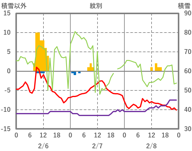 | 日 | 時 | 気温 | 降水 | 風向/風速 | 日照 | 積雪 | 降雪 |