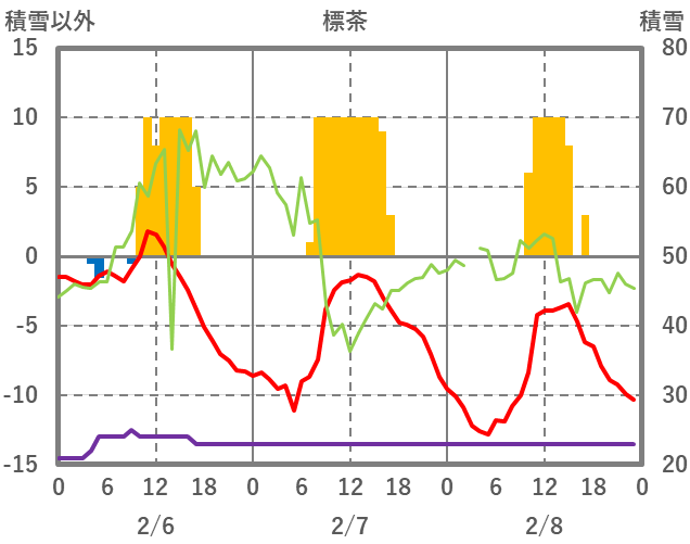 | 日 | 時 | 気温 | 降水 | 風向/風速 | 日照 | 積雪 | 降雪 |