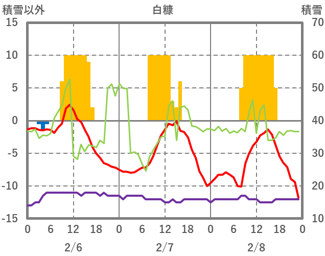 | 日 | 時 | 気温 | 降水 | 風向/風速 | 日照 | 積雪 | 降雪 |