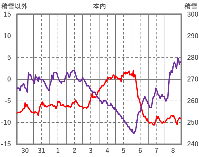 | 日 | 時 | 気温 | 降水 | 風向/風速 | 日照 | 積雪 | 降雪 |
