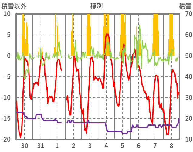 | 日 | 時 | 気温 | 降水 | 風向/風速 | 日照 | 積雪 | 降雪 |