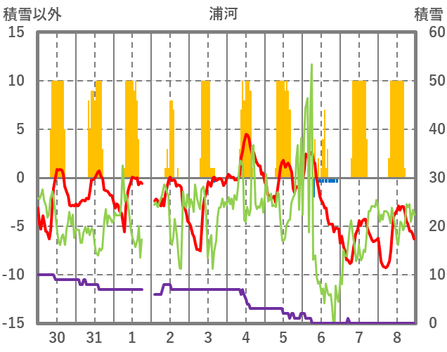| 日 | 時 | 気温 | 降水 | 風向/風速 | 日照 | 積雪 | 降雪 |