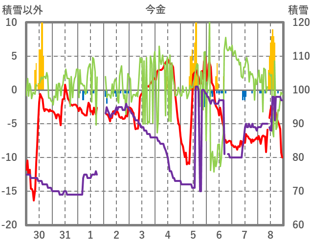 | 日 | 時 | 気温 | 降水 | 風向/風速 | 日照 | 積雪 | 降雪 |