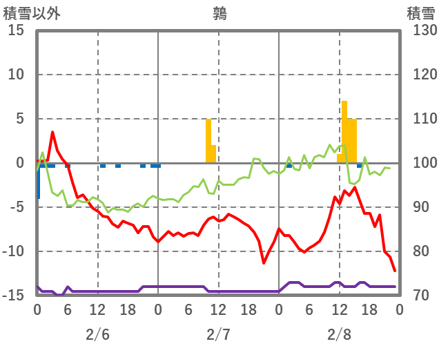 | 日 | 時 | 気温 | 降水 | 風向/風速 | 日照 | 積雪 | 降雪 |