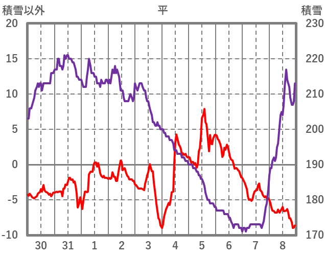 | 日 | 時 | 気温 | 降水 | 風向/風速 | 日照 | 積雪 | 降雪 |