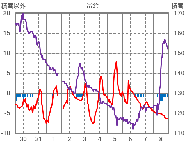 | 日 | 時 | 気温 | 降水 | 風向/風速 | 日照 | 積雪 | 降雪 |