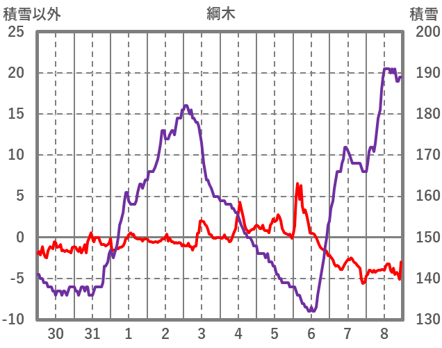| 日 | 時 | 気温 | 降水 | 風向/風速 | 日照 | 積雪 | 降雪 |