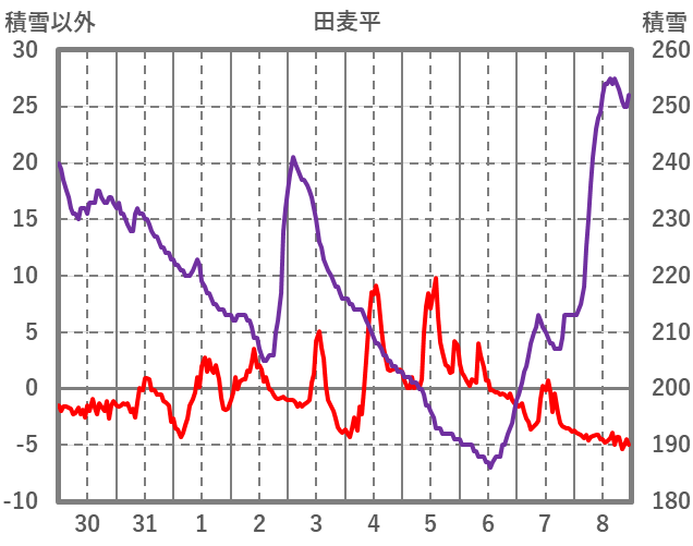 | 日 | 時 | 気温 | 降水 | 風向/風速 | 日照 | 積雪 | 降雪 |