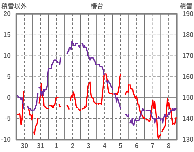 | 日 | 時 | 気温 | 降水 | 風向/風速 | 日照 | 積雪 | 降雪 |