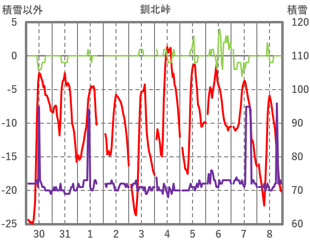 | 日 | 時 | 気温 | 降水 | 風向/風速 | 日照 | 積雪 | 降雪 |