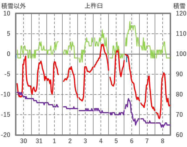 | 日 | 時 | 気温 | 降水 | 風向/風速 | 日照 | 積雪 | 降雪 |