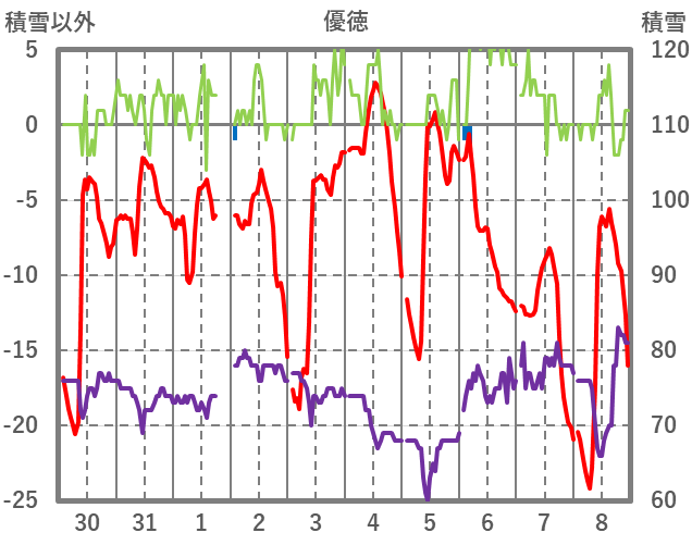 | 日 | 時 | 気温 | 降水 | 風向/風速 | 日照 | 積雪 | 降雪 |