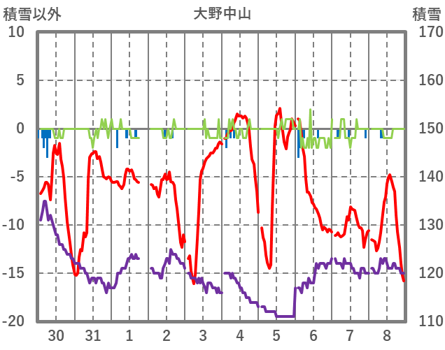 | 日 | 時 | 気温 | 降水 | 風向/風速 | 日照 | 積雪 | 降雪 |