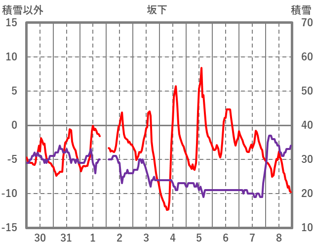 | 日 | 時 | 気温 | 降水 | 風向/風速 | 日照 | 積雪 | 降雪 |