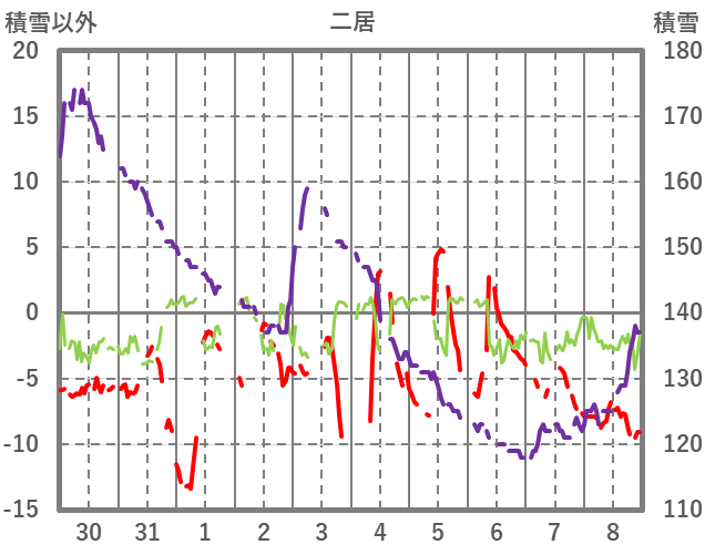 | 日 | 時 | 気温 | 降水 | 風向/風速 | 日照 | 積雪 | 降雪 |