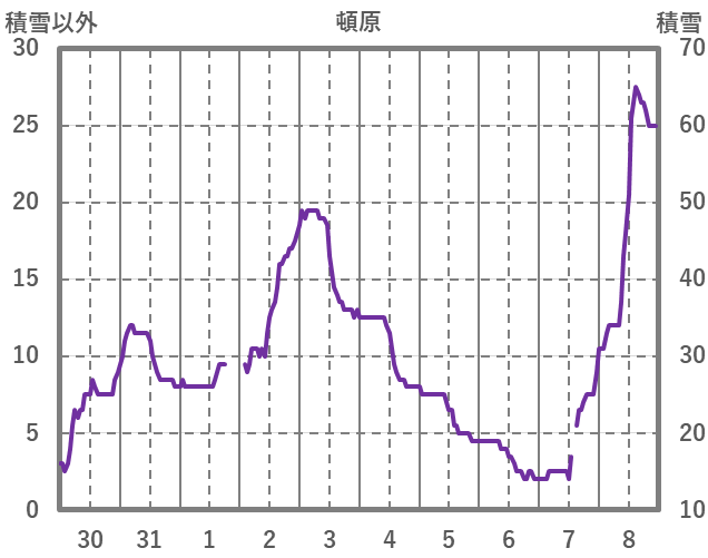 | 日 | 時 | 気温 | 降水 | 風向/風速 | 日照 | 積雪 | 降雪 |