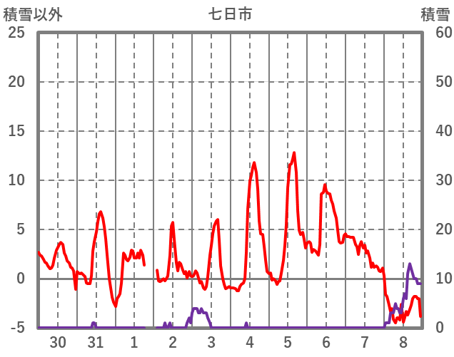 | 日 | 時 | 気温 | 降水 | 風向/風速 | 日照 | 積雪 | 降雪 |