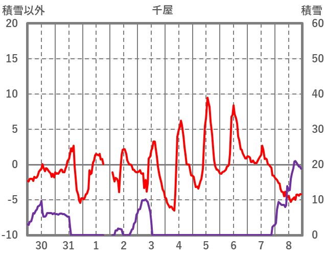 | 日 | 時 | 気温 | 降水 | 風向/風速 | 日照 | 積雪 | 降雪 |